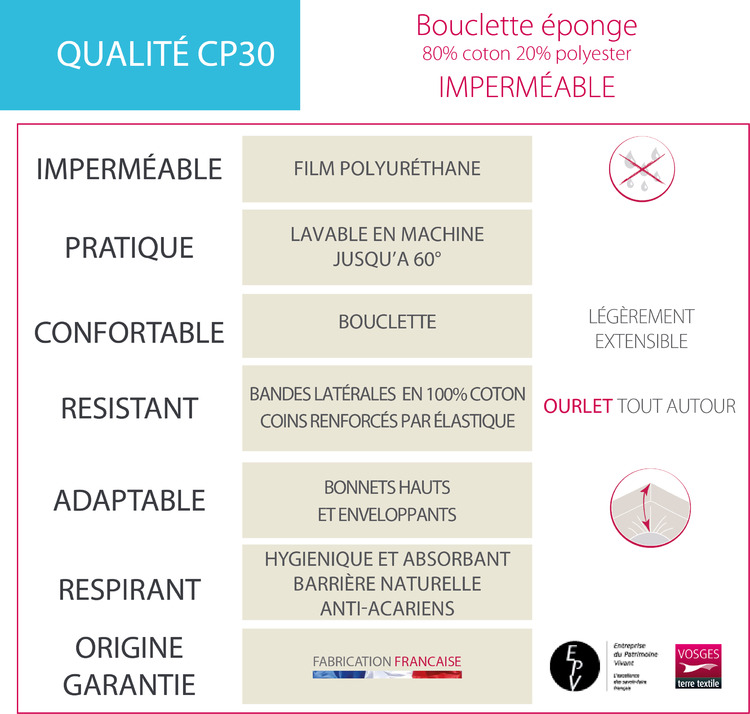 Le protège matelas CP30 imperméable préserve votre bien être. Ils sont souples et légèrement extensibles.