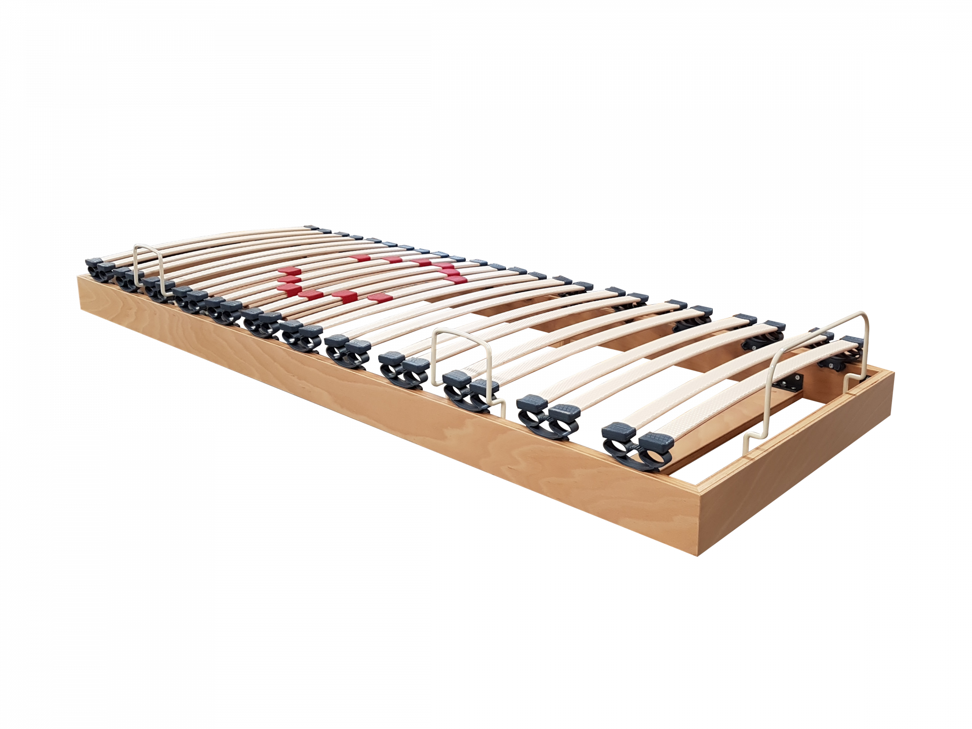 D’abord, nous utilisons des lattes composites spécifiques, « exclusif à la Literie Westelynck » selon un cahier des charges très précis. Elles sont composées de différents matériaux en multicouches, ce qui les rendent plus résistantes que les lattes classiques (hêtre,bouleau). Ces lattes sont gaufrées en surface pour apporter une meilleure ventilation au contact du matelas. Ce qui évite au maximum l’apparition de tâches de moisissure.