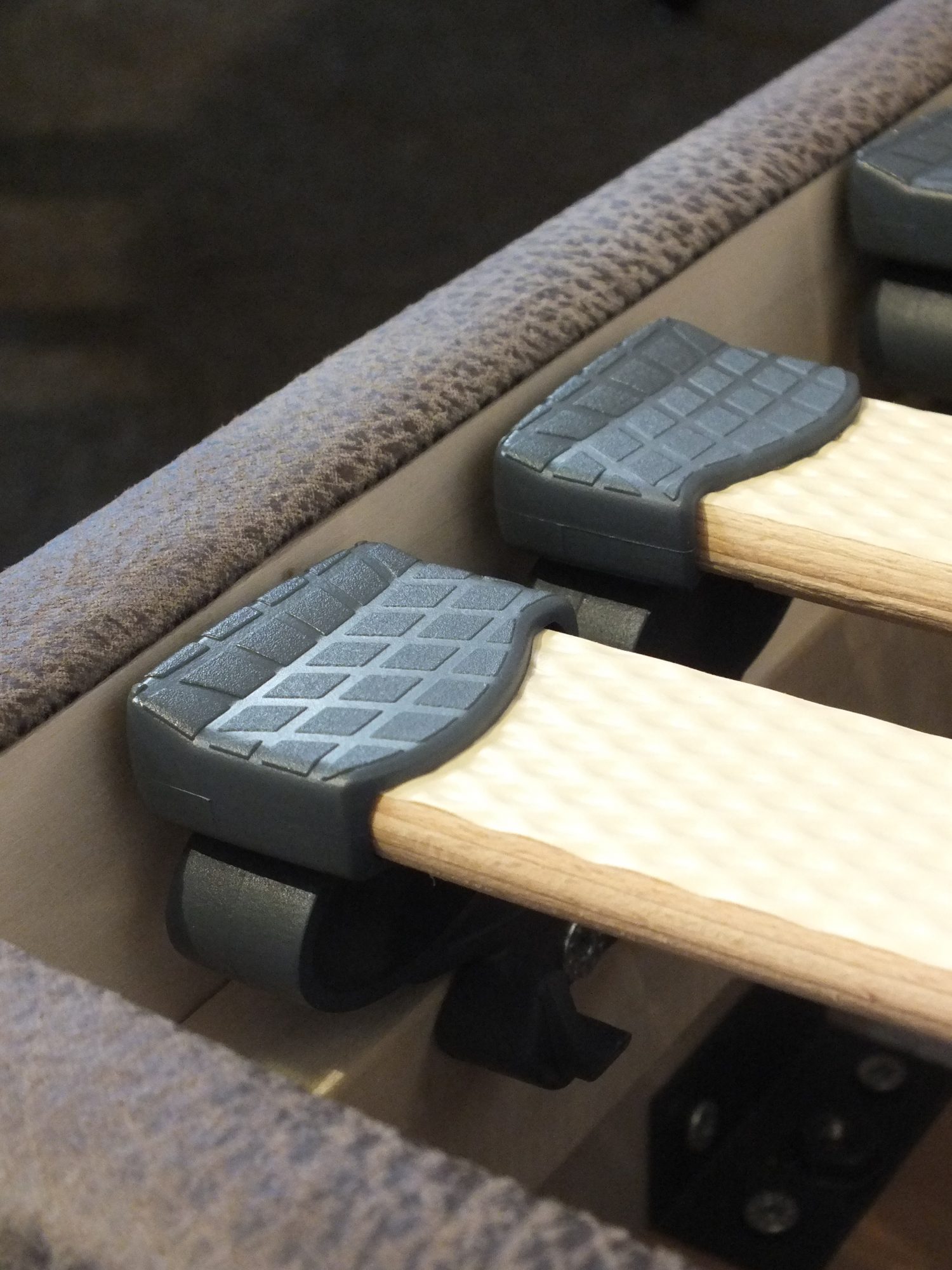 D’abord, nous utilisons des lattes composites spécifiques, « exclusif à la Literie Westelynck » selon un cahier des charges très précis. Elles sont composées de différents matériaux en multicouches, ce qui les rendent plus résistantes que les lattes classiques (hêtre,bouleau). Ces lattes sont gaufrées en surface pour apporter une meilleure ventilation au contact du matelas. Ce qui évite au maximum l’apparition de tâches de moisissure.